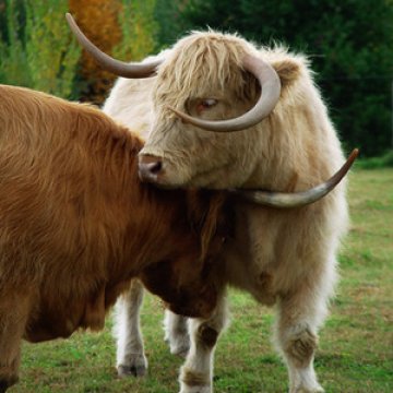 This breed lived for centuries in the harsh, rugged Scottish Highlands, where it developed a resistance to many stress-related and other bovine diseases. It is among the oldest registered breeds. Common cold weather condition and snowfall have little effect on this breed, which has long hair rather than a layer of fat to keep it warm. This also makes for lean beef with piddling exterior waste fat. They also exercise well in southern climates, and volition eat and thrive on brush and weeds other cattle pass by. Highlands have long horns, and long eyelashes and forelocks that protect their eyes from flight insects. They are considered to exist even-tempered and intelligent.