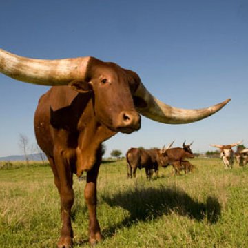 This truly American cattle brood was shaped by a combination of natural pick and accommodation to the surroundings, stemming from the first cattle brought to Northward America more than than 500 years ago. Due to a desire for more rapidly maturing cattle, however, longhorns were near erased by crossbreeding past 1900. The breed was rescued from extinction and has regained popularity. They are hard and adaptable, and are known for high fertility, like shooting fish in a barrel calving, disease and parasite resistance, and longevity. Longhorns likewise eat fibroid forage material more efficiently than most other breeds.