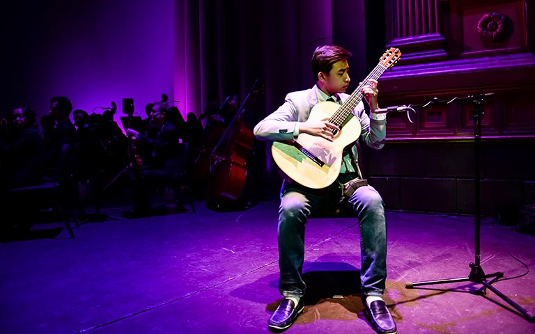 When guitarist Harry Conn walks beyond the stage to receive his undergraduate diploma from UNCSA, information technology will marker the completion of a journeying that, every bit he puts it, has composed a third of his life. He came to the United States from his home country of Vietnam at age xv, and joined the high school guitar studio in the School of Music his junior year.